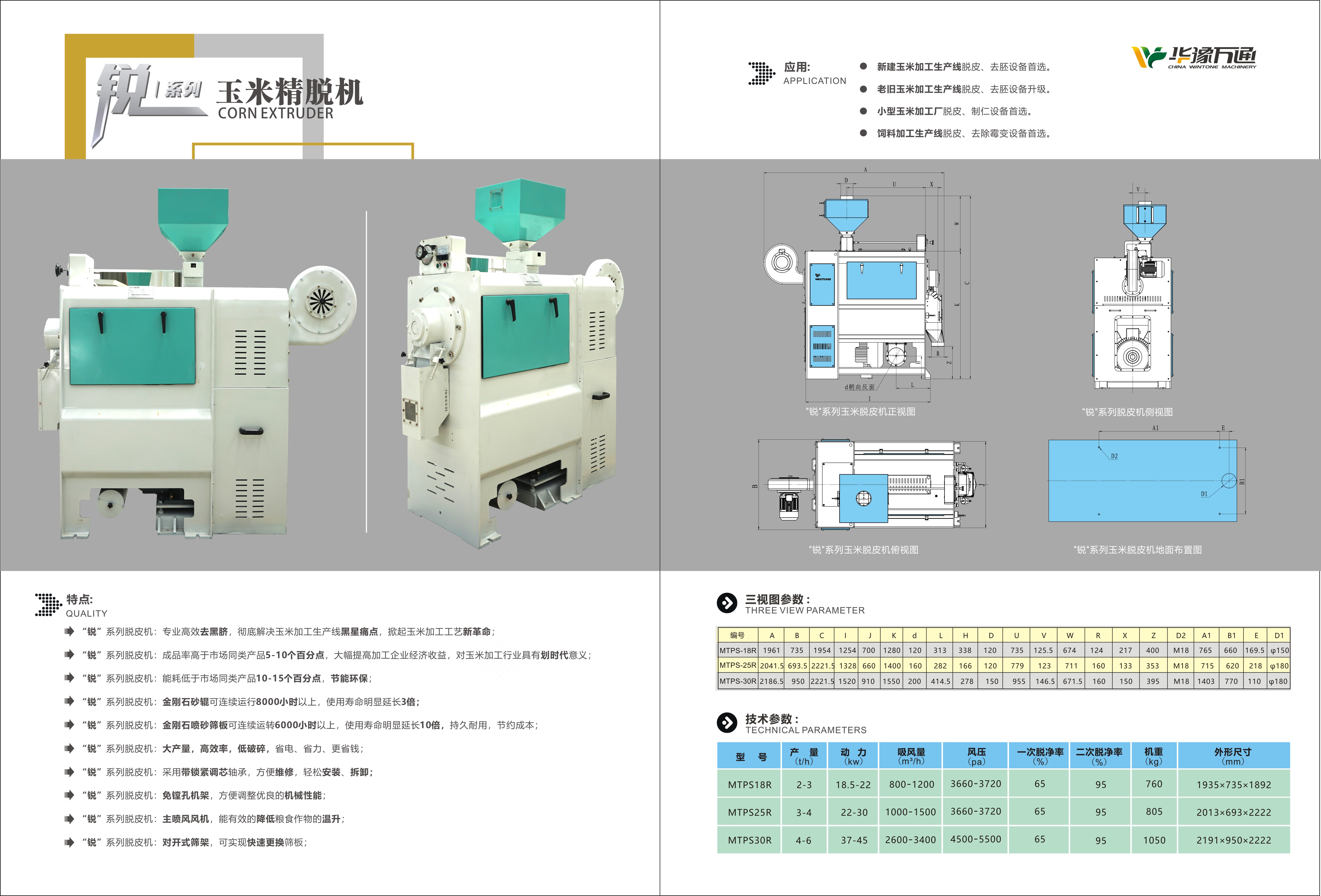 機器概述: 華豫萬通“銳‘系列脫皮機,摒棄傳統(tǒng)脫皮機“碾磨”的加工方式,采用“干式切削剝”技術(shù),可實現(xiàn)對玉米胚乳的分層精細切削剝離及胚芽的一次性剝除,從而達到對脫皮物料的很小破碎率和很佳脫皮效果。一次脫凈率60%,二次脫凈率達95%以上。 同時,相對傳統(tǒng)脫皮機,同樣功率, 產(chǎn)量提升1.5-2倍,節(jié)能降耗,迅速提升玉米加工企業(yè)利潤點。同樣的產(chǎn)量比效果,同樣的效果比能耗。 機器應(yīng)用: *新建玉米加工生產(chǎn)線脫皮、去胚設(shè)備。 *老舊玉米加工生產(chǎn)線脫皮、去胚設(shè)備升級。 *小型玉米加工廠脫皮、制仁設(shè)備。 *飼料加工生產(chǎn)線脫皮、去除霉變及粗纖維設(shè)備。 機器圖片及參數(shù): 機器特點: “銳”系列脫皮機:專業(yè)高效去黑臍,解決玉米加工生產(chǎn)線黑星痛點,掀起玉米加工工藝新潮流; “銳”系列脫皮機:成品率高于市場同類產(chǎn)品5-10個百分點,大幅提高加工企業(yè)經(jīng)濟收益,對玉米加工行業(yè)具有意義重大; “銳”系列脫皮機:能耗低于市場同類產(chǎn)品10-15個百分點,節(jié)能環(huán)保; “銳”系列脫皮機:金剛石砂輥可連續(xù)運行8000小時以上,使用壽命明顯延長3倍; “銳”系列脫皮機:金剛石噴砂篩板可連續(xù)運轉(zhuǎn)6000小時以上,使用壽命明顯延長10倍,持久耐用,節(jié)約成本;“銳”系列脫皮機:大產(chǎn)量,低破碎,省電、省力、更省錢; “銳”系列脫皮機:采用帶鎖緊調(diào)心軸承,方便維修,輕松安裝、拆卸; “銳”系列脫皮機:免鏜孔機架,方便調(diào)整出優(yōu)良的機械性能; “銳”系列脫皮機:主軸噴風(fēng)風(fēng)機,能有效的降低糧食作物的溫升; “銳”系列脫皮機:對開式篩架,可實現(xiàn)快速更換篩板; 產(chǎn)成品展示: 更多糧食加工設(shè)備:歡迎咨詢?nèi)A豫萬通 :0371-86635901