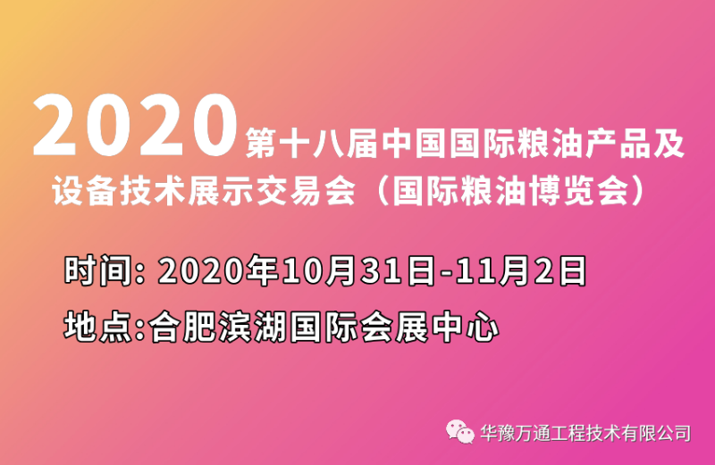 2020年10月31日,合肥濱湖國際會展中心,華豫萬通誠邀您蒞臨展位,了解華豫萬通新雜糧設備,探討雜糧加工工藝,共襄盛舉。華豫萬通作為糧機設備展區(qū)重點企業(yè),本次將攜帶多款新研發(fā)設備亮相展會。